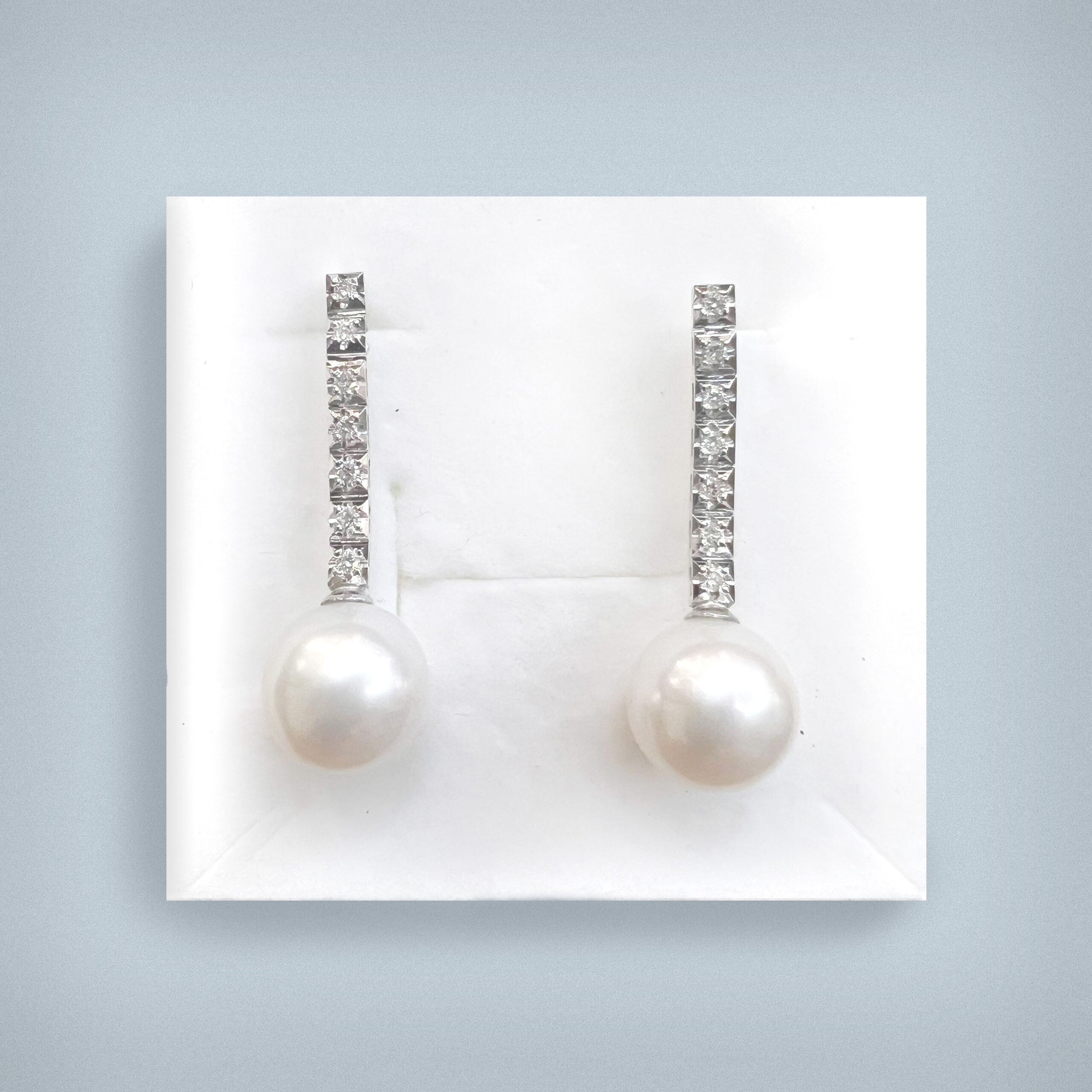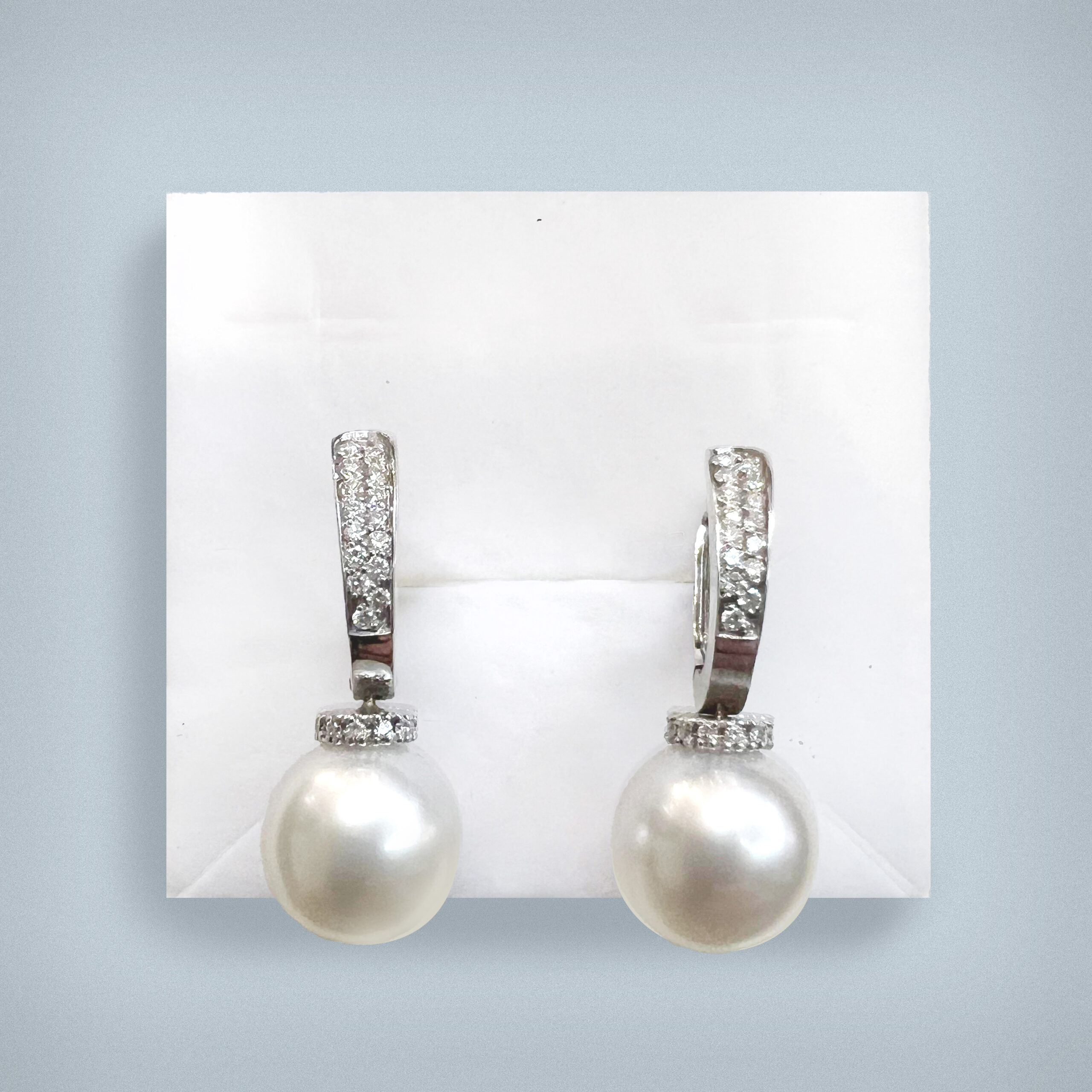 Orecchini in oro bianco 18 KT, Perle Coltivate d’Acqua Dolce 10-10,5 mm, Brillanti 0,19 KT purezza VS colore F