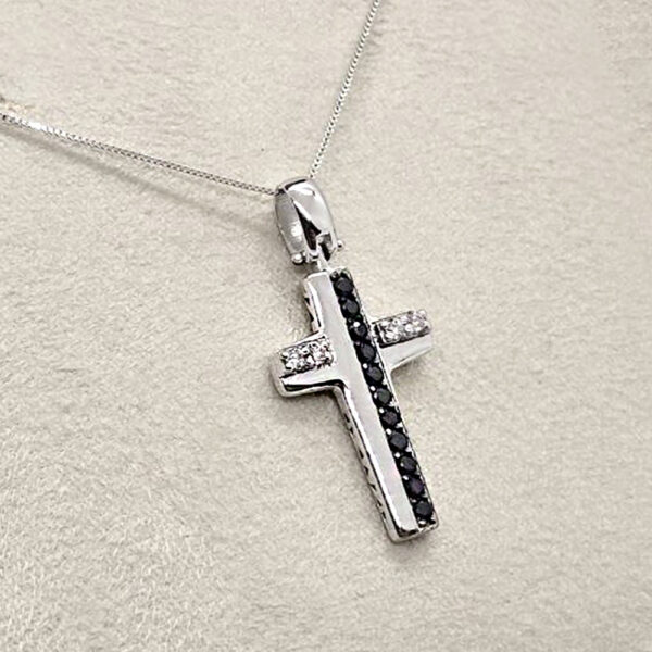 Collana con Croce e Brillanti Neri e Bianchi, Oro 18kt 3,06 gr, Brillanti 0,08 kt purezza VS colore, Brillanti Neri 0,20 kt