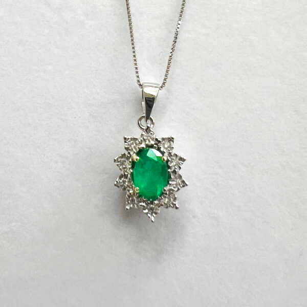 Collona in oro bianco 18 KT gr 3,16 con pendente di Smeraldo e Diamanti, Smeraldo 0,80 KT, Brillanti 0,06 KT purezza VS colore G
