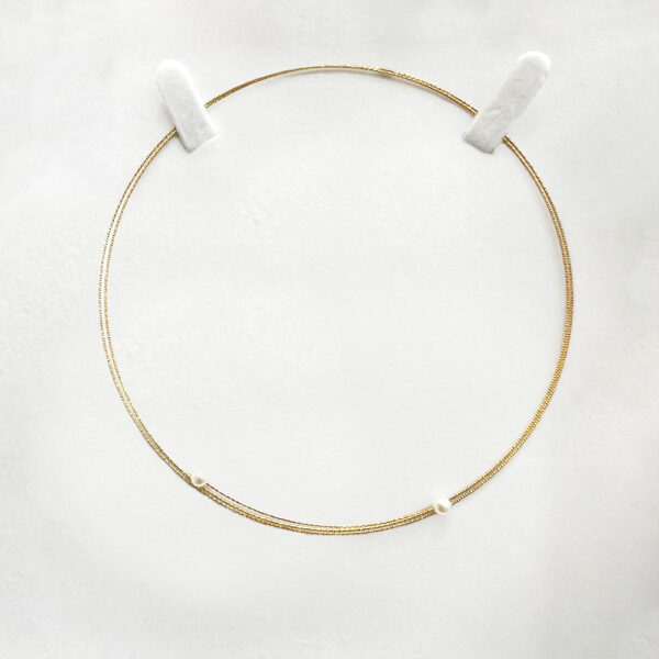 Una collana filiforme d’oro, rigida e sinuosa, avvolge il collo come un abbraccio prezioso, simboleggiando la forza e l’eternità dell’amore e della protezione.