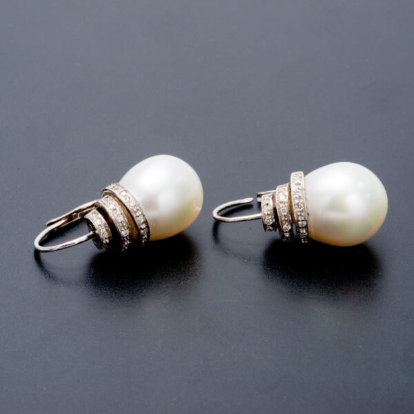Orecchini con perle in oro bianco 18 KT gr 12,00 con perle Australiane KT 39,00 con brillanti KT 0,18 purezza VVS1 colore F