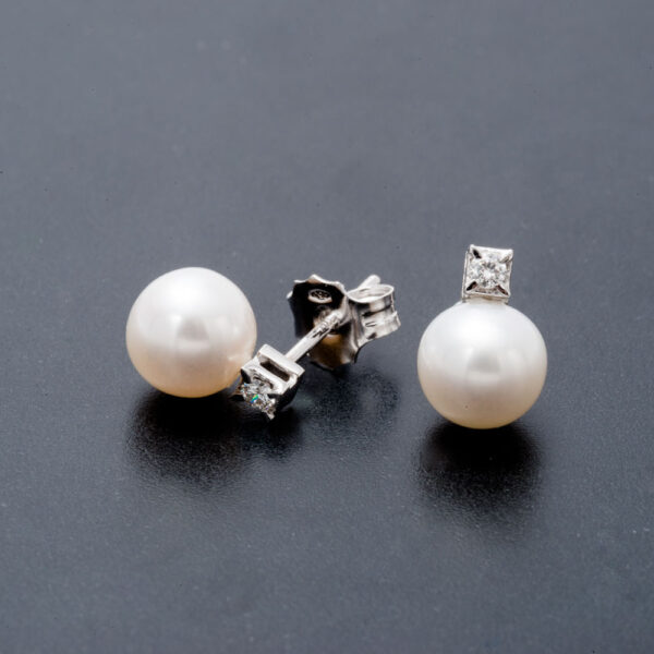 Orecchini con perle in oro bianco 18 KT gr 0,90 con perle coltivate mm 7,50 e brillanti KT 0,04 purezza VVS1 colore F