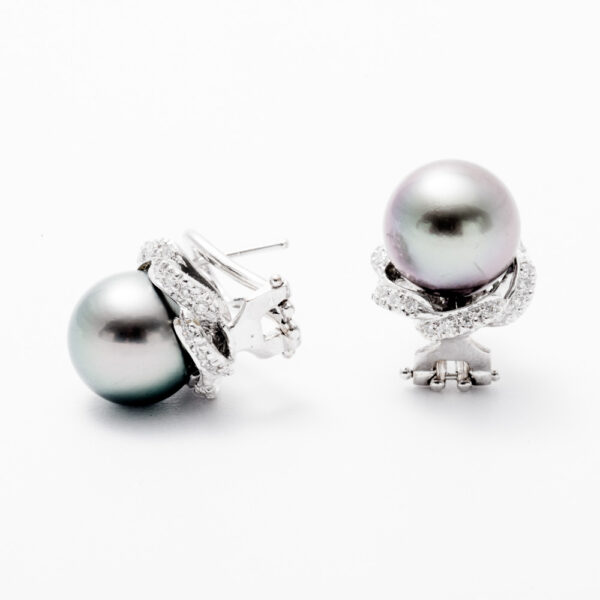 Orecchini con perle in oro bianco 18 KT gr 8,40 con perle Tahiti KT 19,00 e brillanti KT 0,40 purezza VVS1 colore F